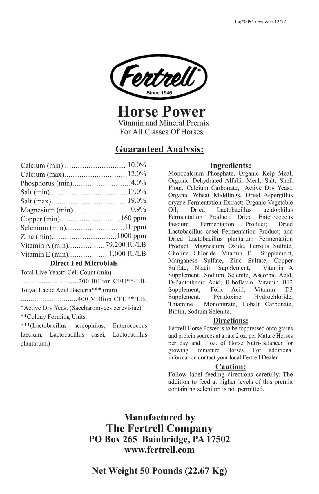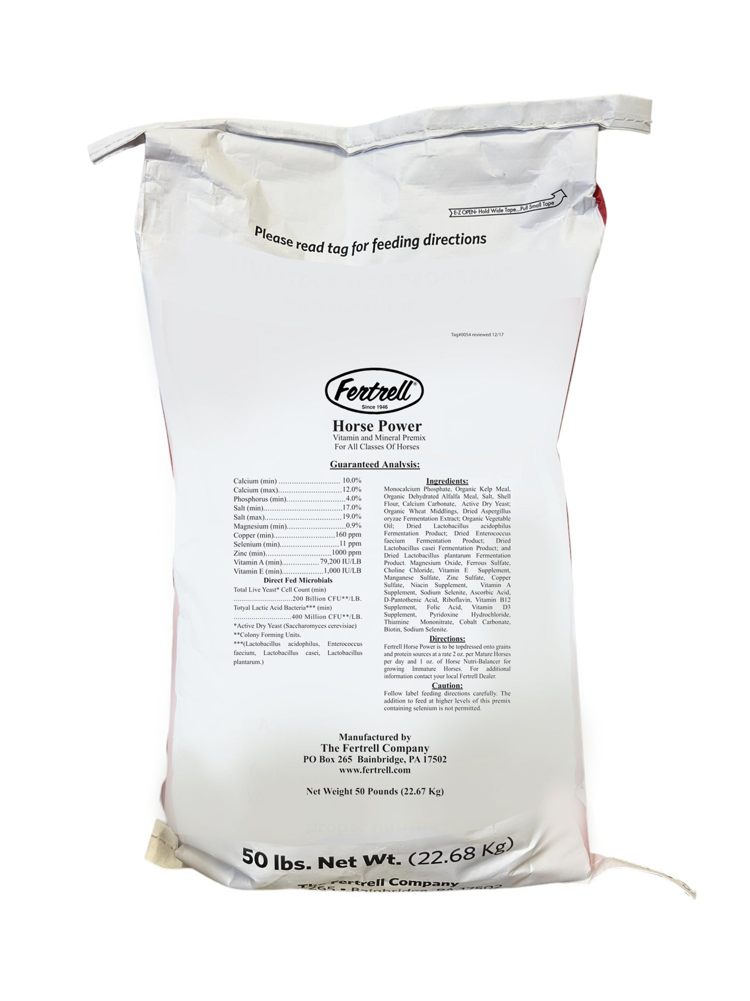 Horse Power is a vitamin/mineral premix with added probiotics to enhance digestion and help improve performance while promoting muscle development which promotes strength, stamina and muscle tone. Add to grains for a complete horse feed. ****Not available for purchase in Florida